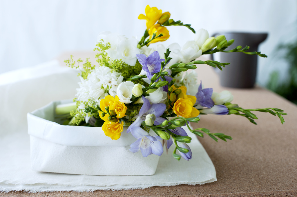 The freesia has sparkling colours and leaves a subtle hint of perfume around the home. The fragrance takes you back in time and often evokes memories. Freesias are frequently used as an extra flower in a (bridal) bouquet or arrangement. We would like to show you a different side to the freesia, and give it the starring role. Finally we are also asking you to ‘freestyle’ with freesias and thereby inspire other florists.